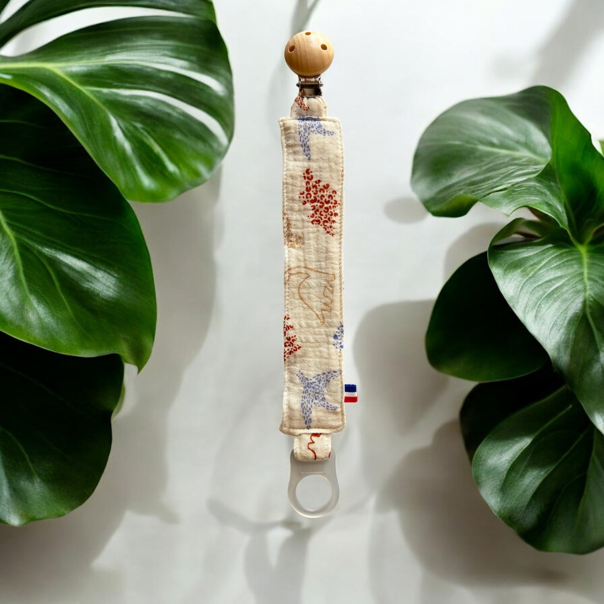 Attache tétine en bois, tissu double gaze de coton avec motifs dinosaures, attache silicone.