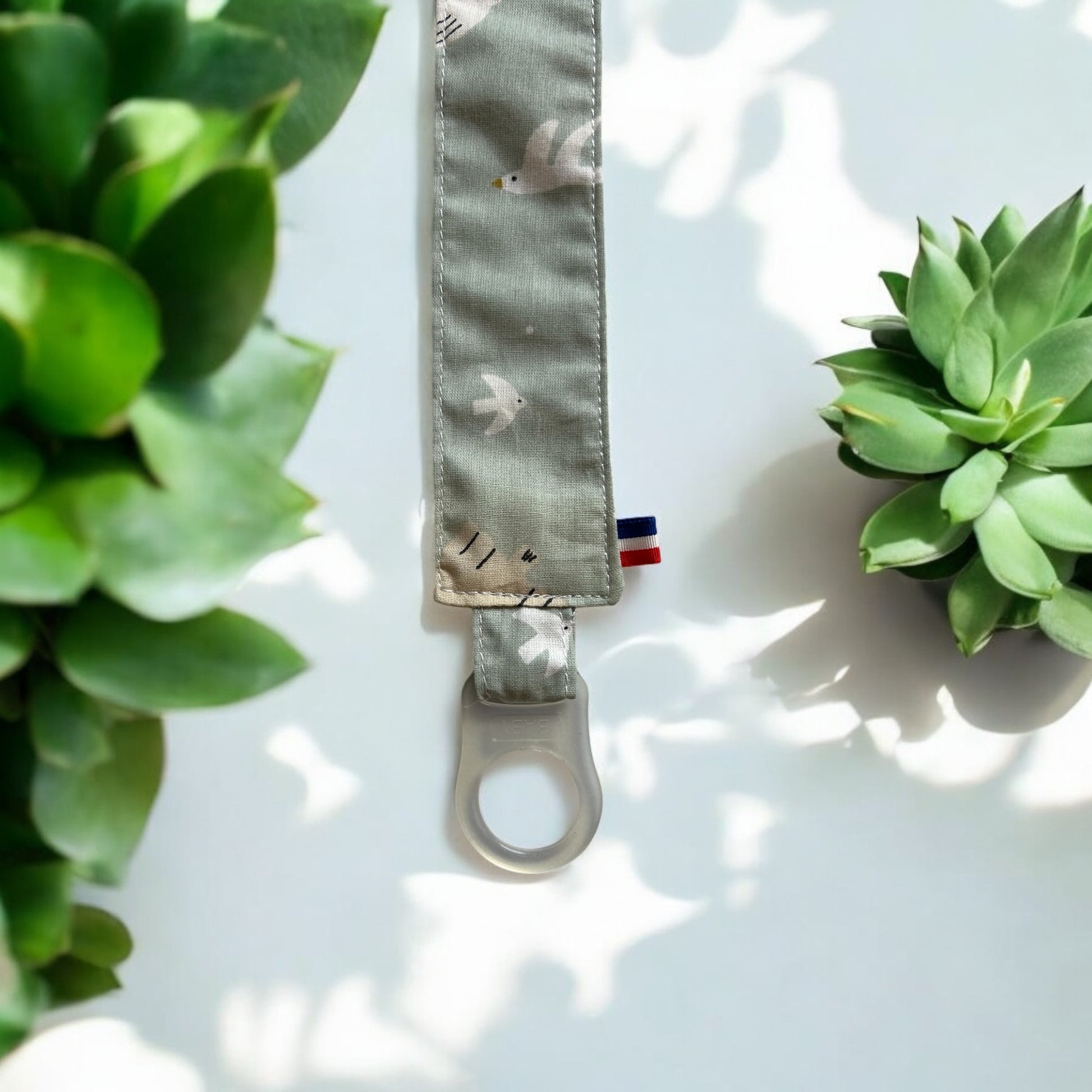 Attache tétine en bois vernis, tissu coton certifié eoko-tex, fond bleu clair et imprimé oiseaux. L’attache tétine est en silicone transparente.