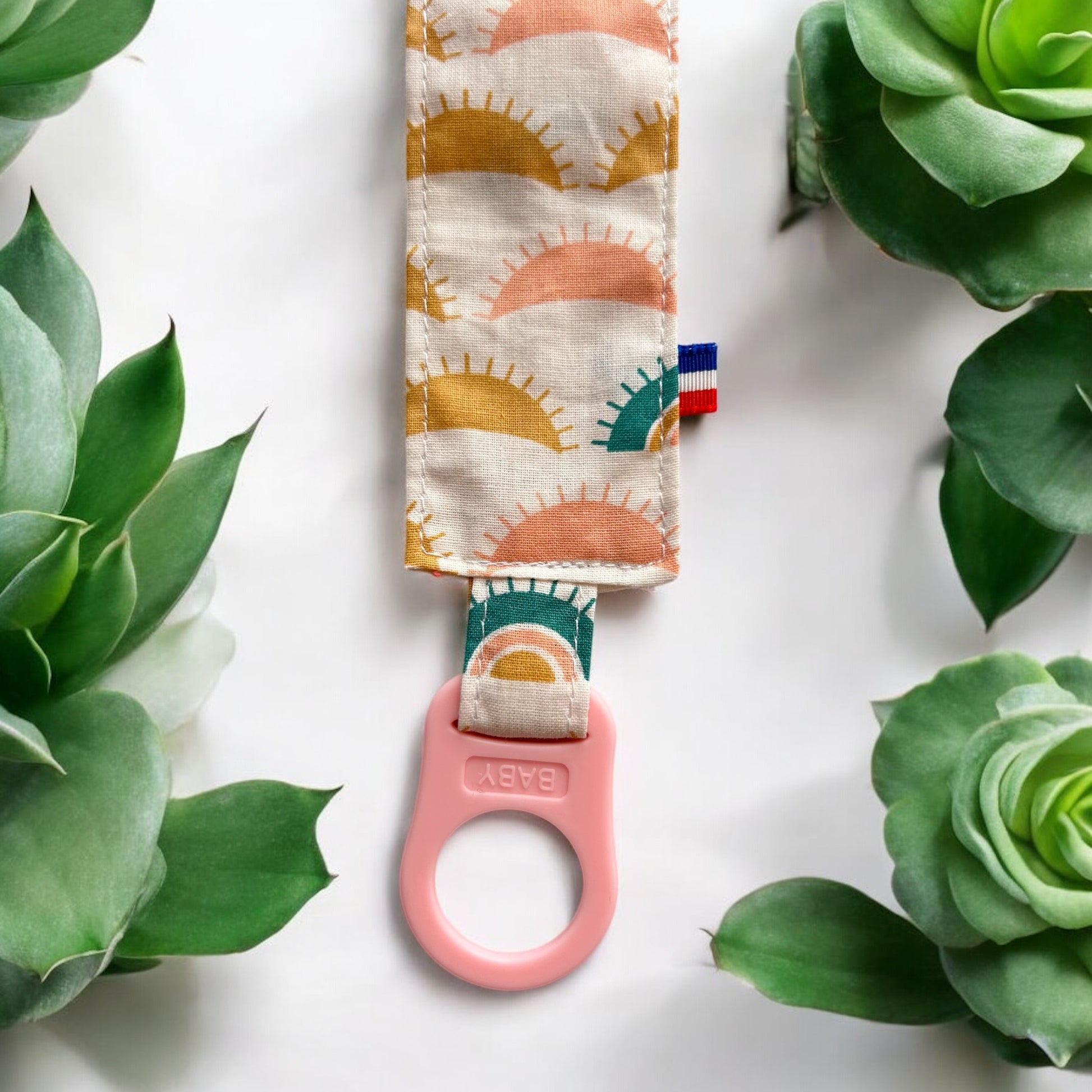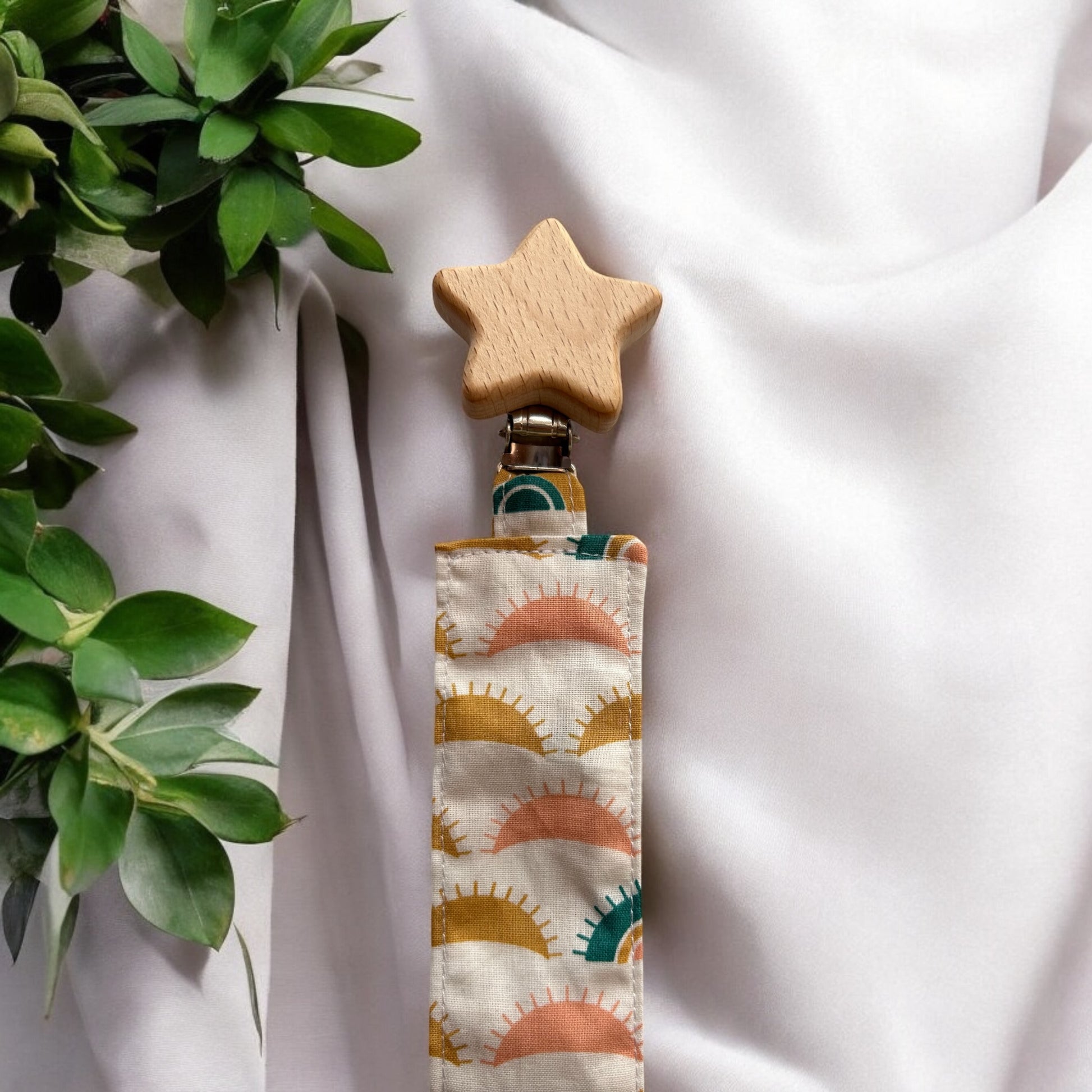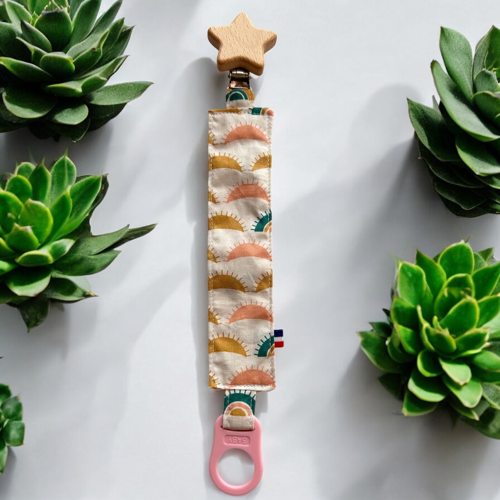 Attache tétine en bois forme étoile, tissu en coton imprimé soleil de différentes couleur. Attache tétine en silicone rose.