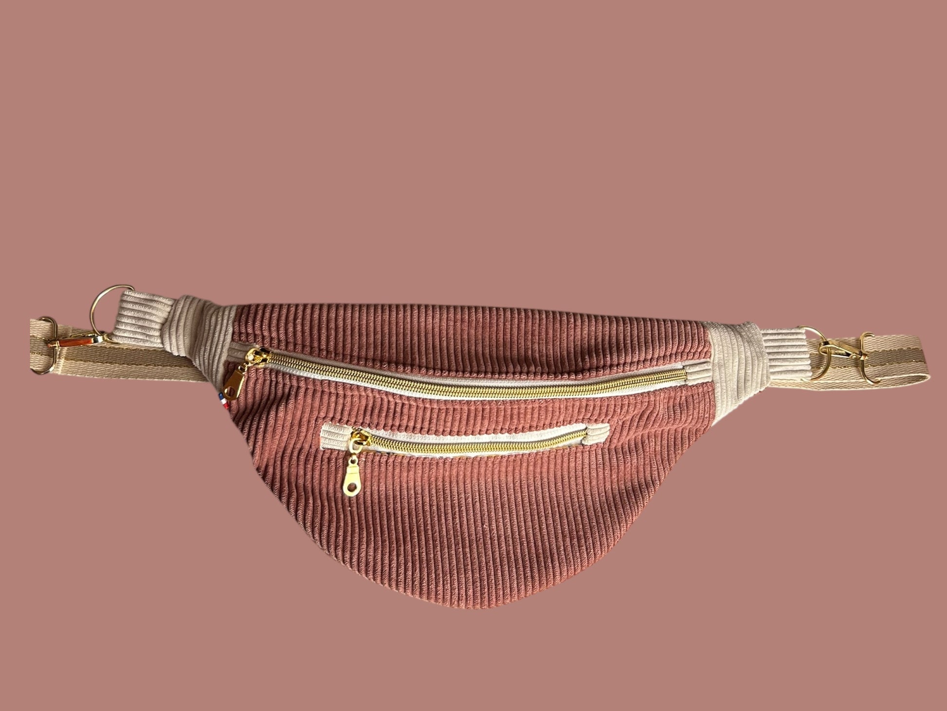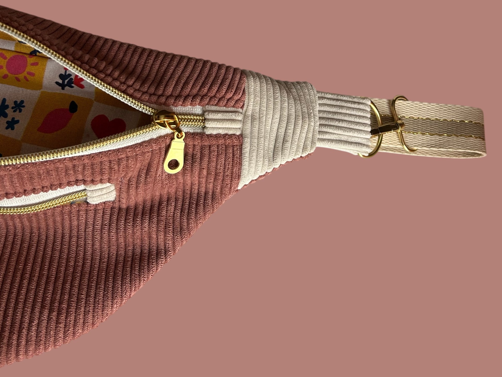 Banane en velours côtelé bicolore : crème et rose. Intérieur coloré.
