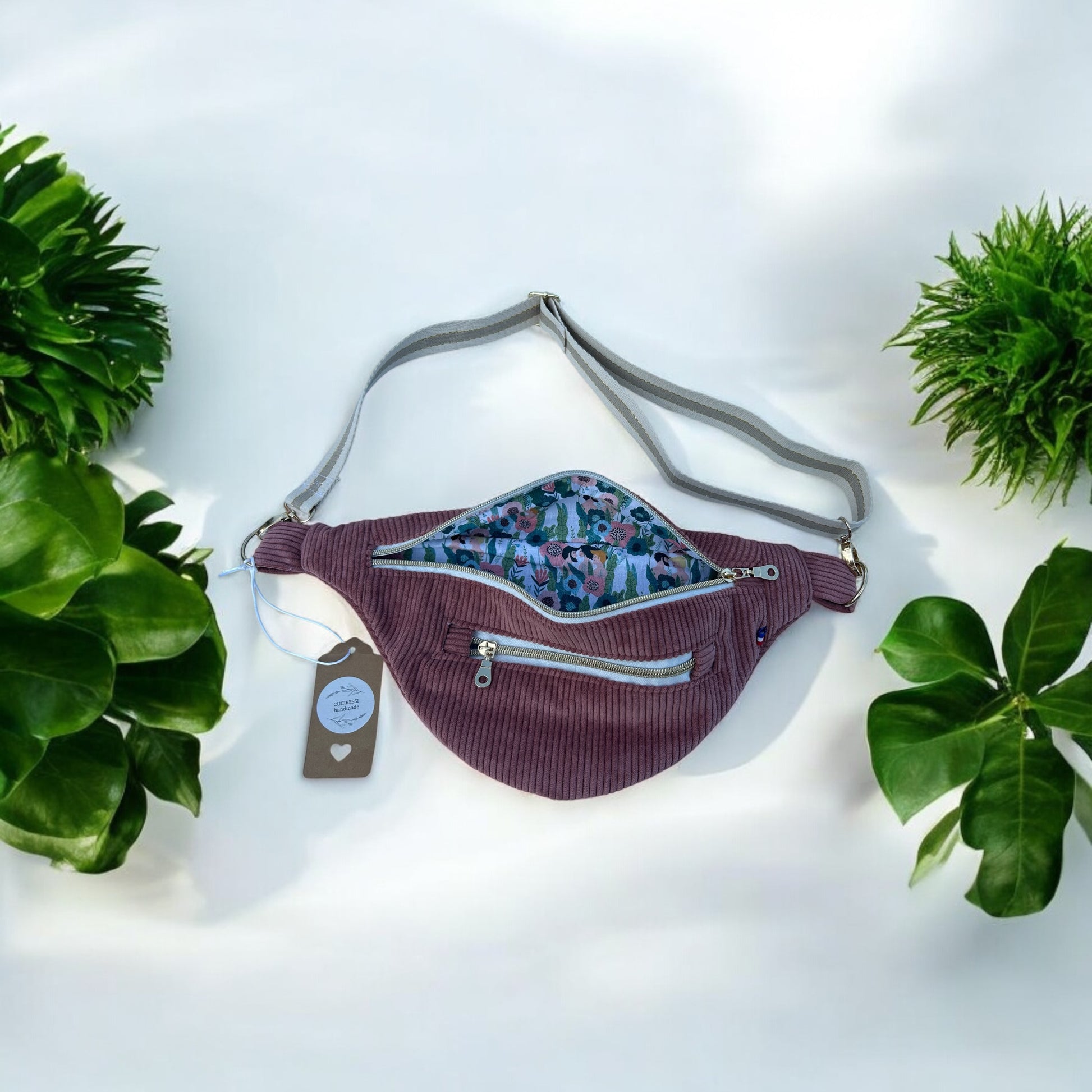 Banane en velours côtelé rose. Une grande poche et une petite poche.