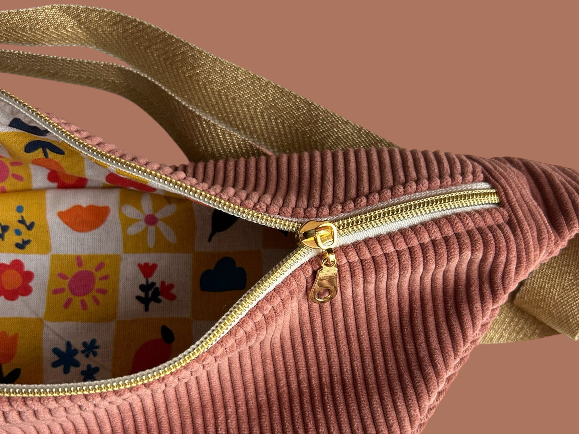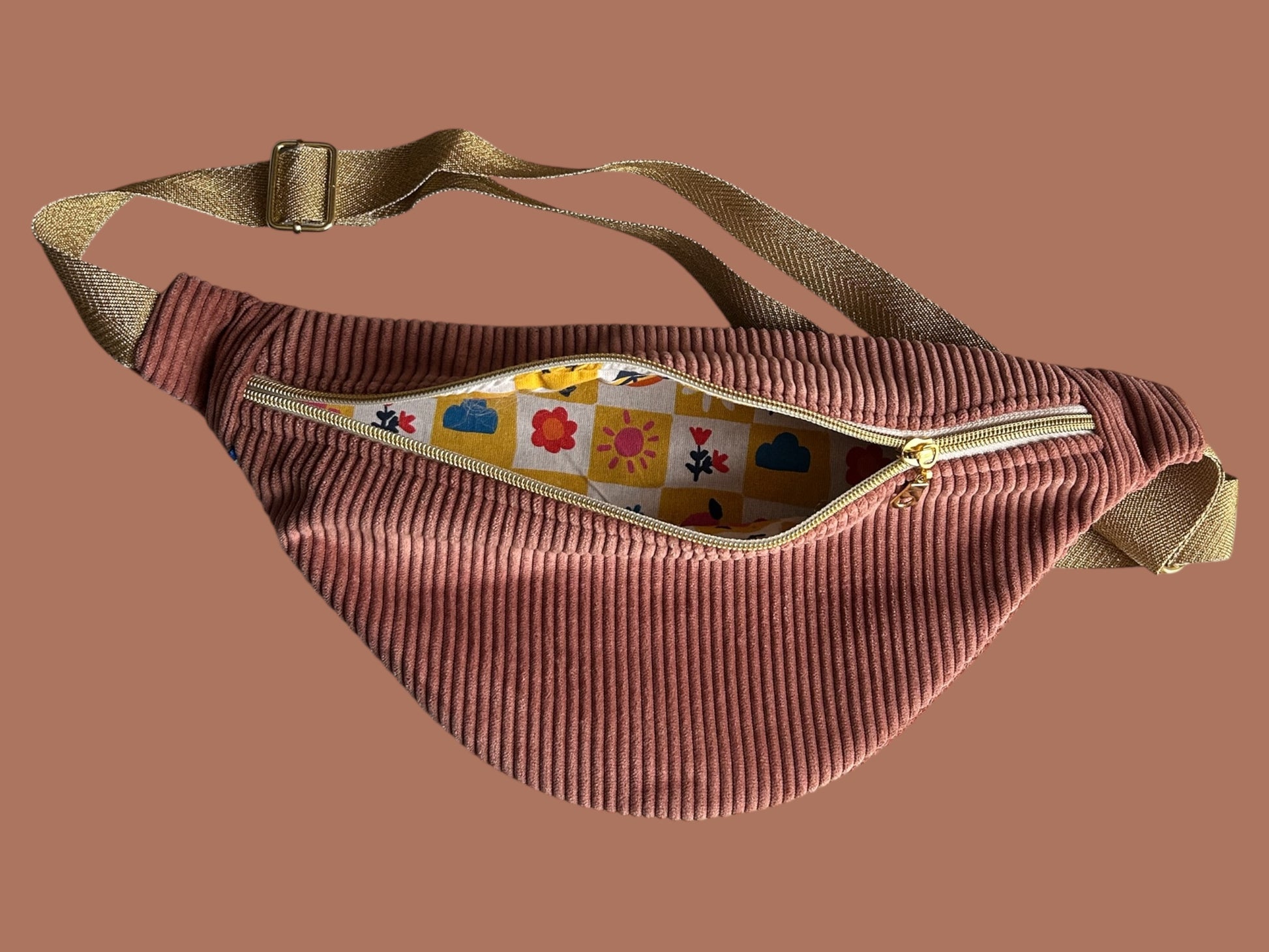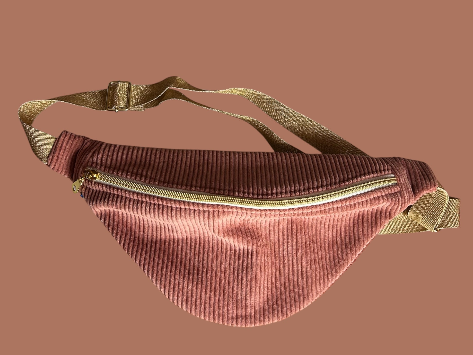 Banane velours rose côtelé, intérieur coloré. Sangle dorée réglable.