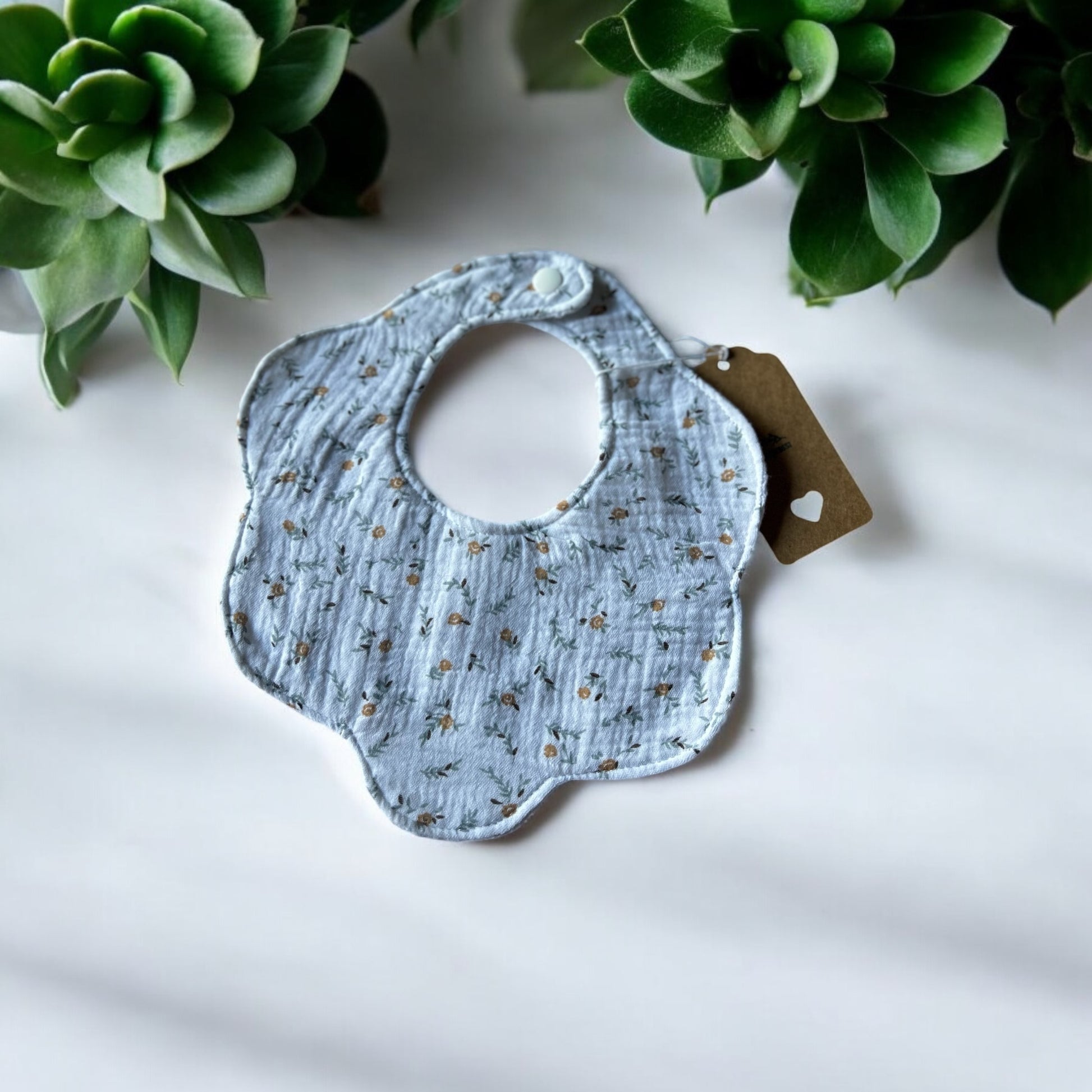 Bavoir modèle cosmos, tissu blanc double gaze de coton à motifs fleuri jaune, vert. Envers matière nid d’abeille. Pression blanche.