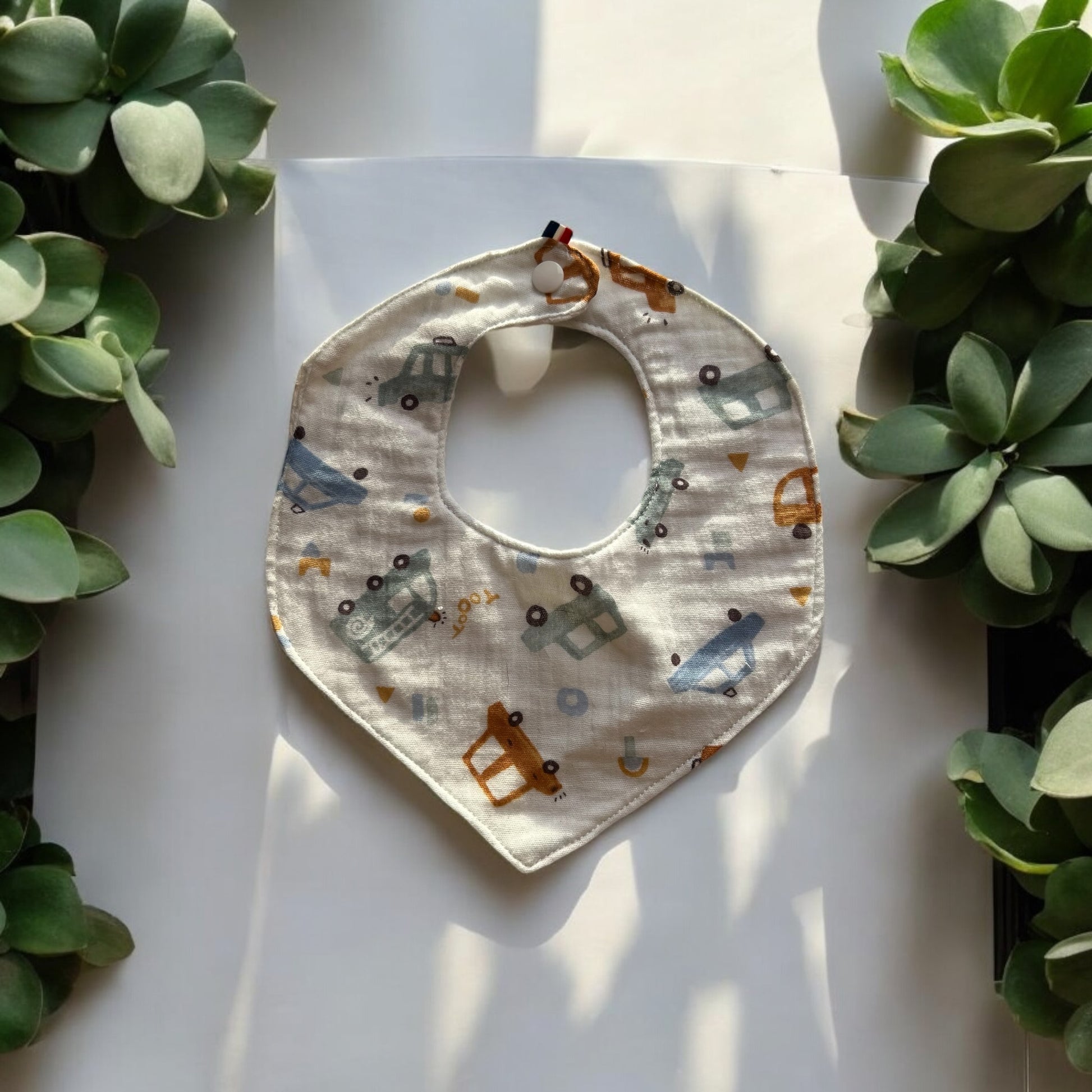 Bavoir bandana, tissu double gaze de coton imprimé voitures, tissu nid d’éponge blanc.