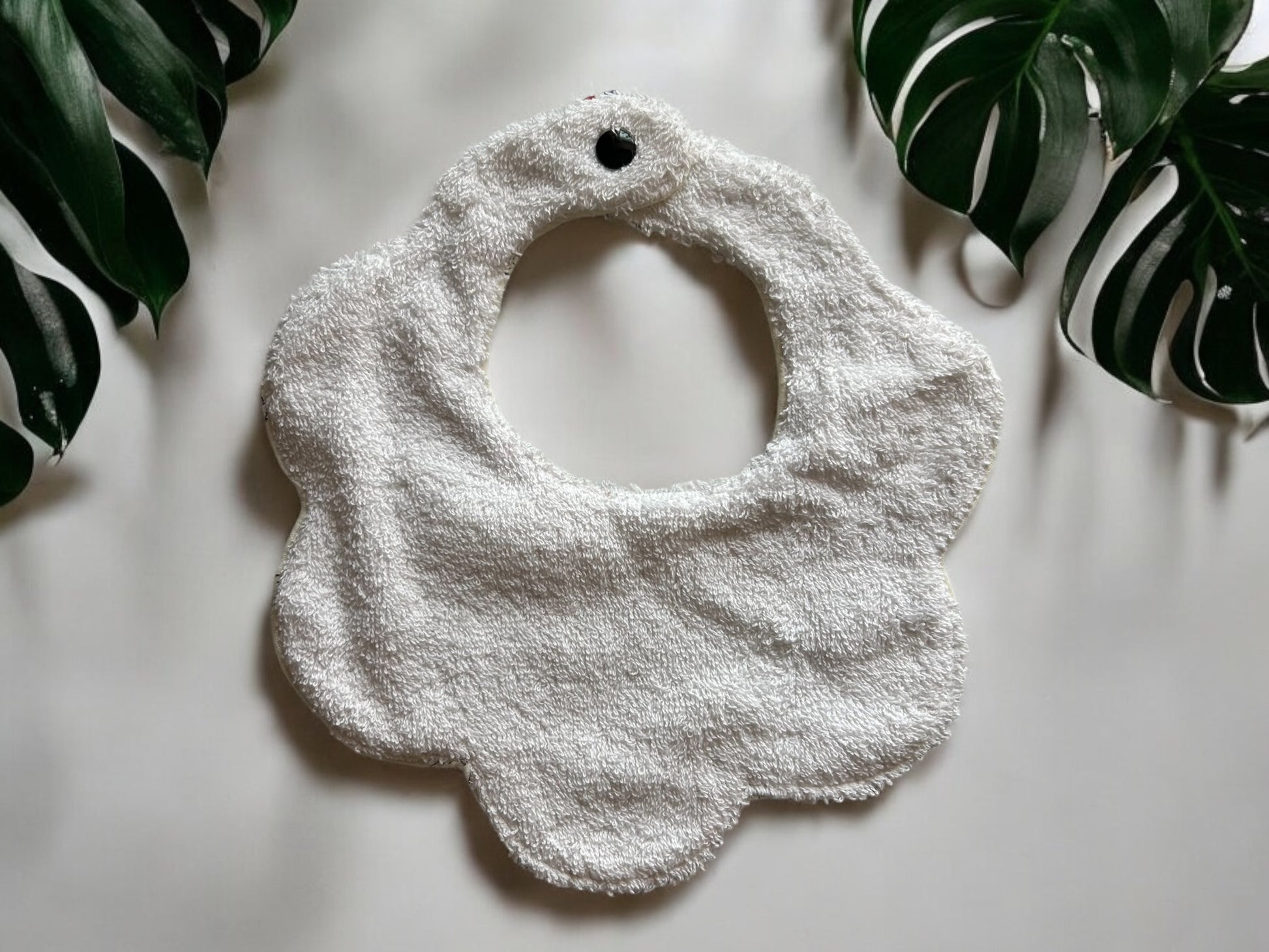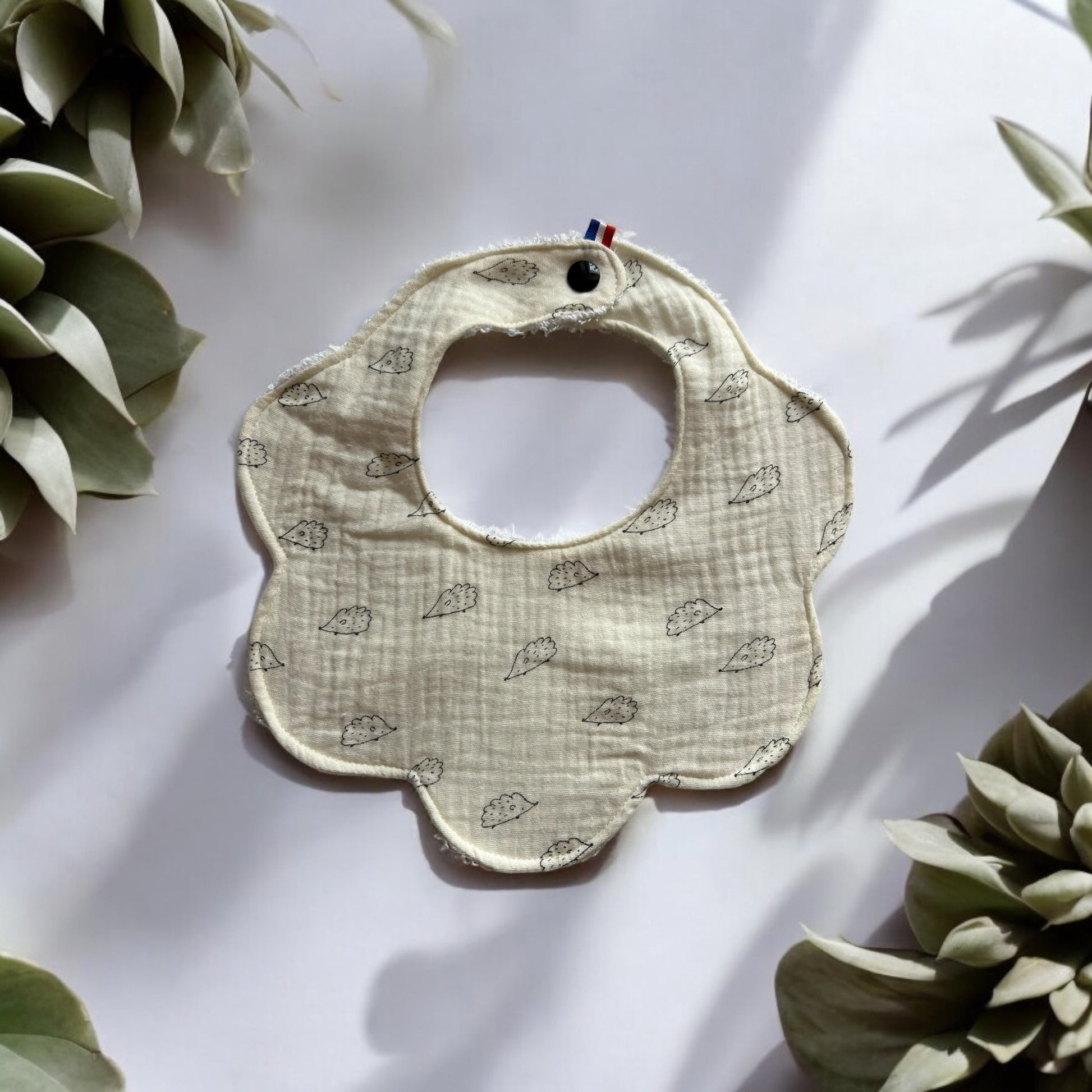 Bavoir modèle cosmos, tissu crème double gaze de coton à motifs hérisson noir. Envers matière éponge. Pression noire.