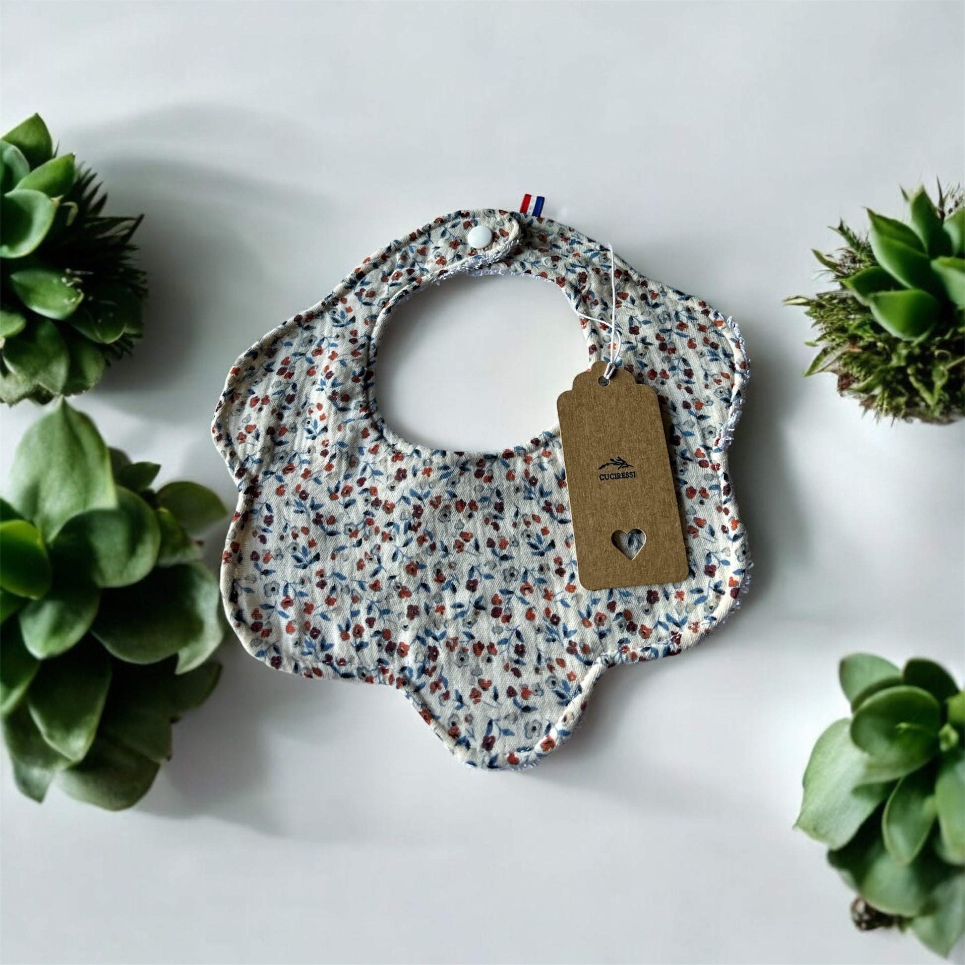 Bavoir modèle cosmos, tissu crème double gaze de coton à motifs fleuri bleu et bordeaux. Envers matière éponge. Pression blanche.