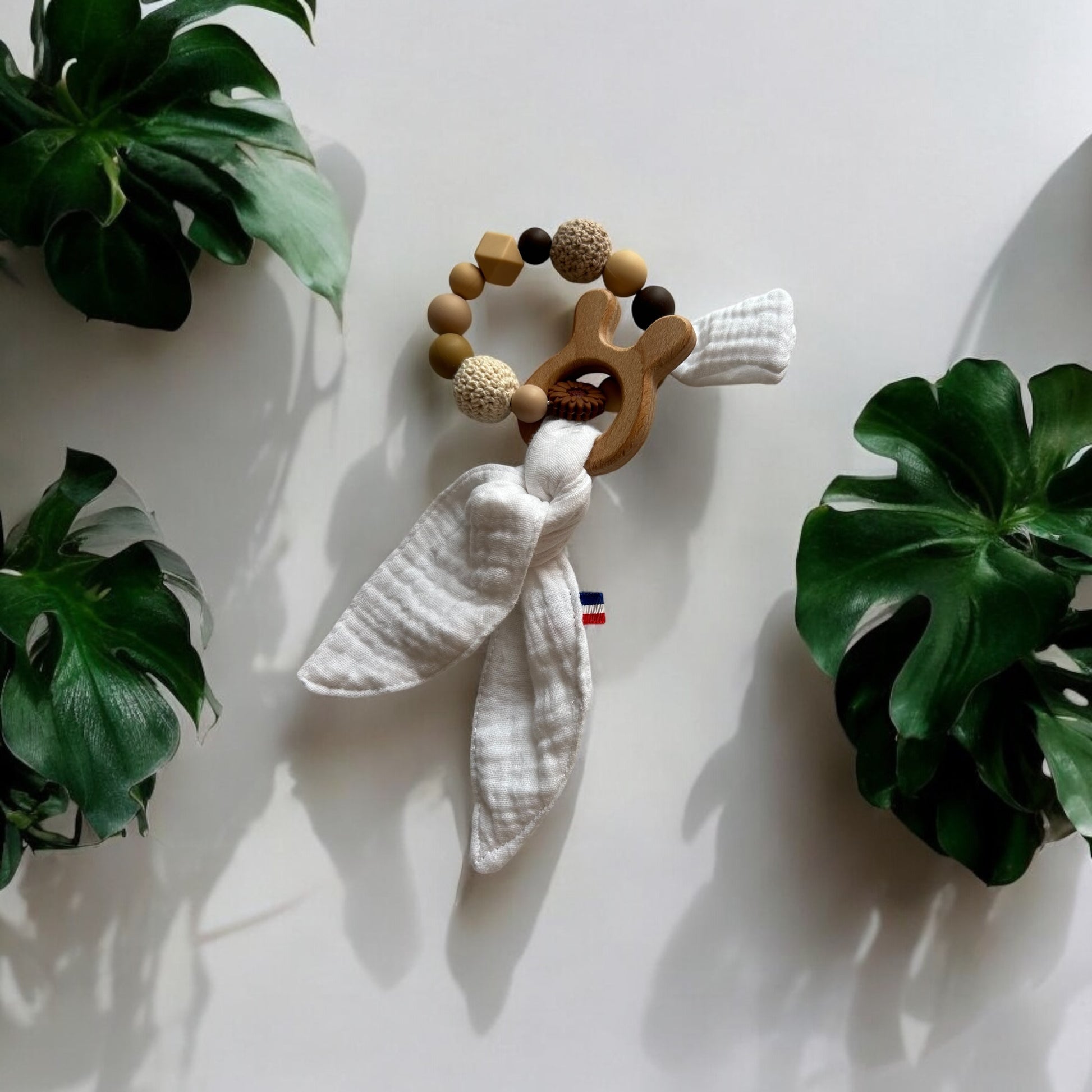 Hochet en double de gaze de coton blanc certifié oeko-tex, anneau en bois, perles en silicone.