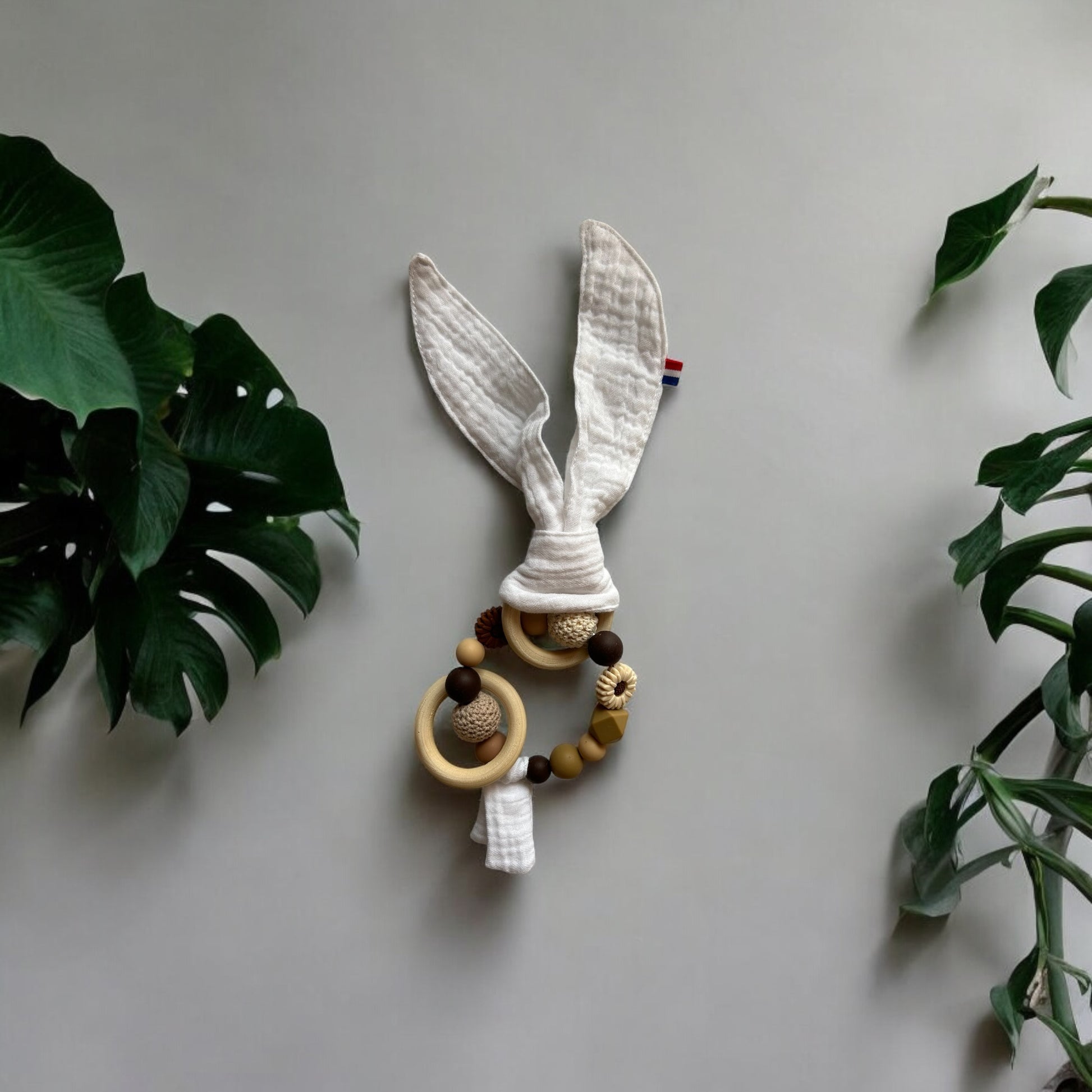 Hochet en double de gaze de coton blanc certifié oeko-tex, anneaux en bois, perles en silicone formes : fleurs, hexagonales, rondes.